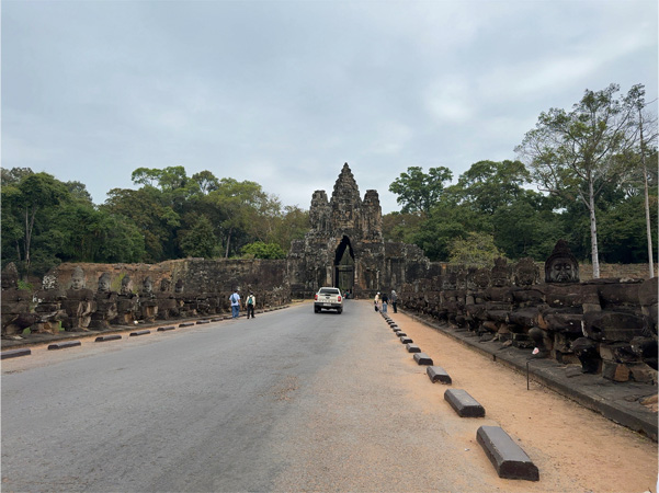 広い池と高い城壁に囲まれた1辺約3kmの都市の遺跡、アンコール・トム。公園の入り口で下車し、塔の形をした5つの門のうち、南大門をくぐって城内に入った。
