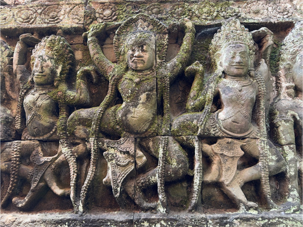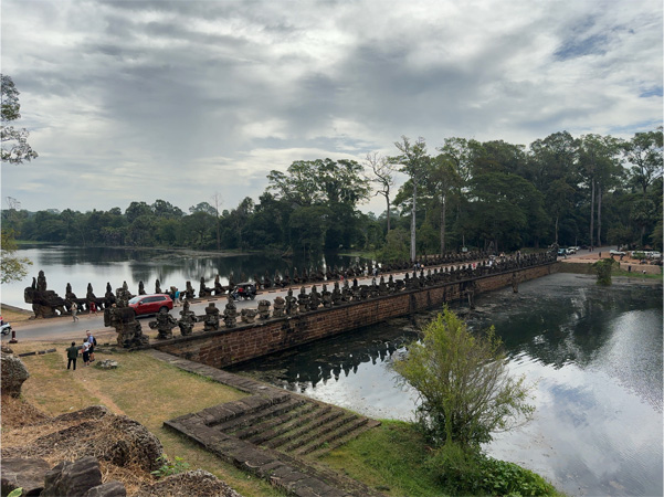 | ↑南大門へと続く橋の欄干。阿修羅が一列になって蛇の神「ナーガ」を引っ張っている。阿修羅はカンボジアの言語、クメール語でも「アシュラ」だそうだ。 |