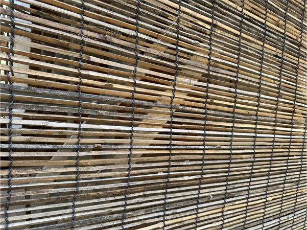 | ↑修復中の祠堂を覆う竹のすだれ。風通しがよさそうだ。 |