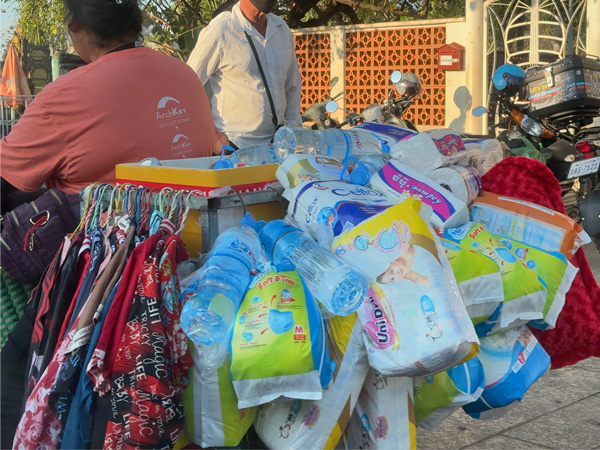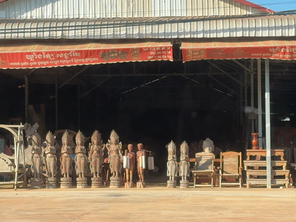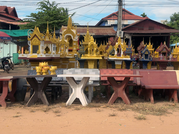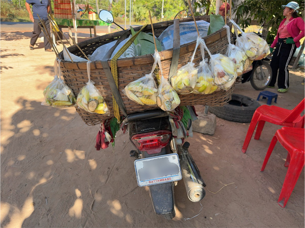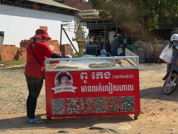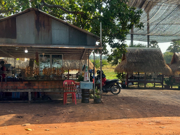 | ↑クメール語をグーグル翻訳したら、「貝類販売」。池や湿地が多いので、売り物はタニシのような淡水の貝じゃないかな。 |