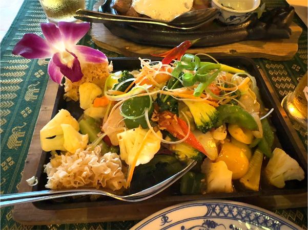 | ↑野菜炒め。添えられた飾り切りやランの花が楽しい気分を盛り上げてくれた。 |