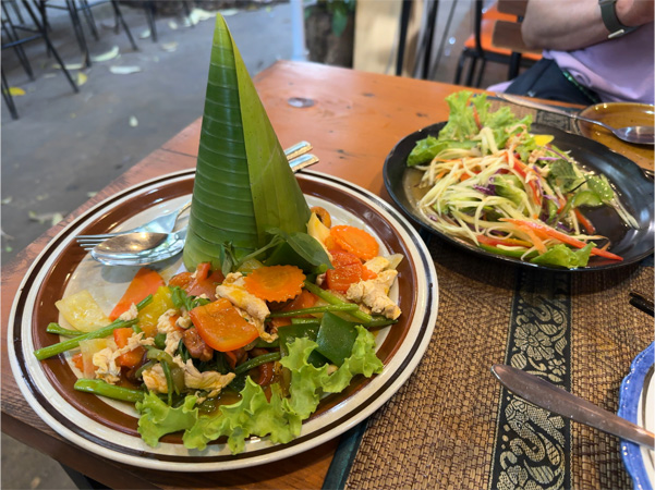 | ↑とり肉と野菜のしょうが炒め。尖ったバナナの葉っぱ飾りの下にご飯が隠れているよ。右は若いマンゴーのサラダ。ほんのり甘酸っぱいソースが絡めてある。 |