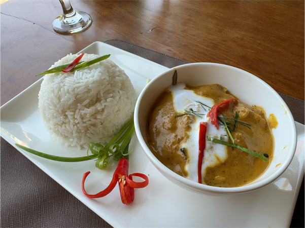 帰国日のお昼ご飯は、宿泊先ホテル「プリンス・アンコール・ホテル&スパ」のレストラン、「ブルー・ダイヤモンド」にて。白身の淡水魚の雷魚をココナッツミルクや香辛料で煮込んだクメール料理「アモック」をいただいた。