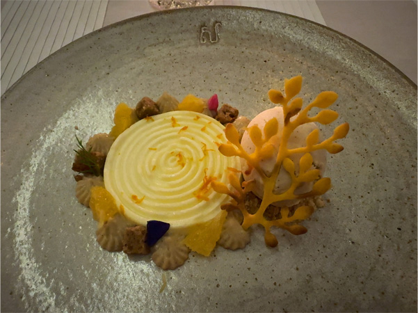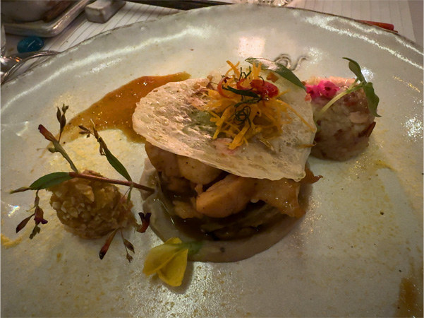 カンボジア人女性のシェフがカンボジアの食材と調理法を駆使して創作しているという、上質で洗練された料理。ファースト、セカンドの両メインコース、デザート、ワインなど、夕方6時から9時まで3時間かけて味わった。