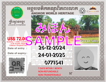 観光目的でカンボジアに入国する場合、オンラインでビザ(査証)が申請できる。入国時に空港で取得する方が安いが、あらかじめ自宅で都合のいい時に落ち着いて手続きできるので、同国外務省のe-Visaシステムを利用して申請した(申請料はクレジットカード払い)。手順はわかりやすかったが、顔写真がなかなか認識されなかった。背景の色と顔の色との違いが小さいことが原因だったようだ。カラーから白黒に変え、コントラストを少し上げたらうまくいった。 遺跡公園の入場チケットの販売窓口はシェムリアップに1か所しかないため、入場チケットも旅行前にオンラインで購入しておいた。カンボジア政府下の団体「アンコール・エンタープライズ」が発券する、QRコード付きのデジタルチケットだ。私たちはアンコール遺跡公園の7日間有効チケット(次の画像)と、コー・ケー遺跡公園のチケットを購入した。遺跡の入り口で係員さんに提示すると、専用アプリでQRコードを読み取っていた。