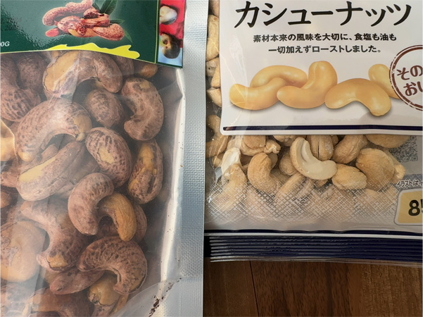 シェムリアップには地元の農産品を加工した、お土産にいいものがたくさんある。特にカンボジアは良質なカシューナッツの生産国とのことで、旅行前から楽しみにしていた。実が大きいことは知っていたが、まさかこんなに大きいとは(次の写真参照)。別々のお店で合計2パック買ったが、どちらもほんのり塩味がついていた。薄皮付きが普通だが、スーパーマーケットではきれいにはがしたものも売っている。評判通り、甘味が強い。脂肪分が少ないのかな、あっさりめだ。
