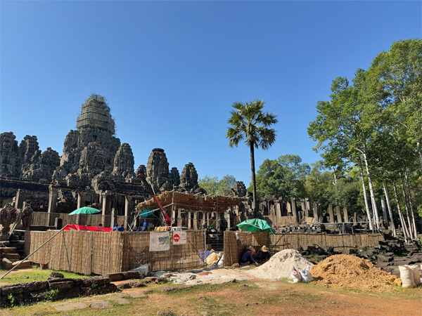 アンコール・トムのバイヨン寺院には49基もの仏塔がある。中でもひときわ高くそびえる中央の仏塔は修理中で、てっぺんにぐるりと足場が組まれていた。作業場は日よけで覆われ、まるでばんそうこうを巻いたみたいだ。