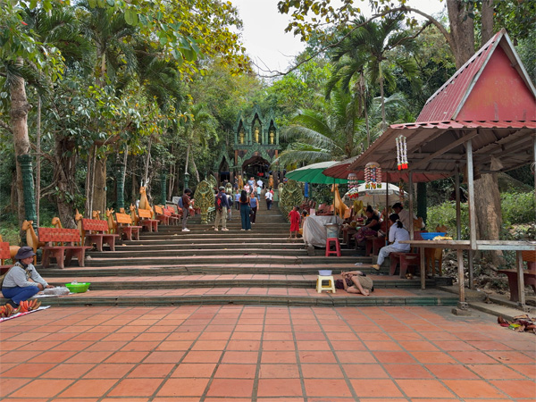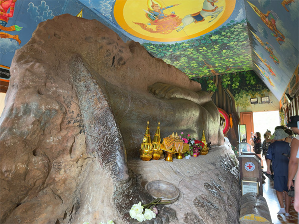 巨大な砂岩のてっぺんに、8mの涅槃像「プリア・アン・トム」が彫刻されている。アンコール時代後の16世紀に造像されたといわれる。 靴脱ぎ場で靴を脱いで階段を上がり、プリア・アン・トムが安置されているパゴダ(お寺)を参拝した。