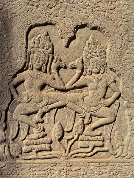 アンコール・ワットの壁には女神・デヴァターの像がたくさん彫られている。回廊のテラスを渡り歩きながら、ガイドさんが次から次へとデヴァター像を指し示してくれた。あまりにたくさんあって、とてもじゃないけれど写しきれない。3重の回廊のうち、2番目の回廊の途中で「もう十分撮ったのでこの先は結構です〜」と音を上げてしまった。半ば満足し、半ばくたびれ果てながら「何体あるんですか?」と尋ねたところ、「正確な数はわかっていませんが、ガイド仲間の1人が1,802まで数えました」との答えが返ってきた。うわ、数えた人いるんだ!しかも「まで」というからには、もっとたくさんあるのだろう。