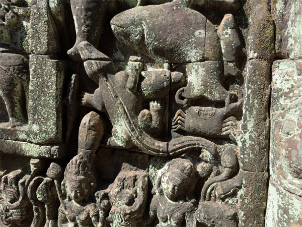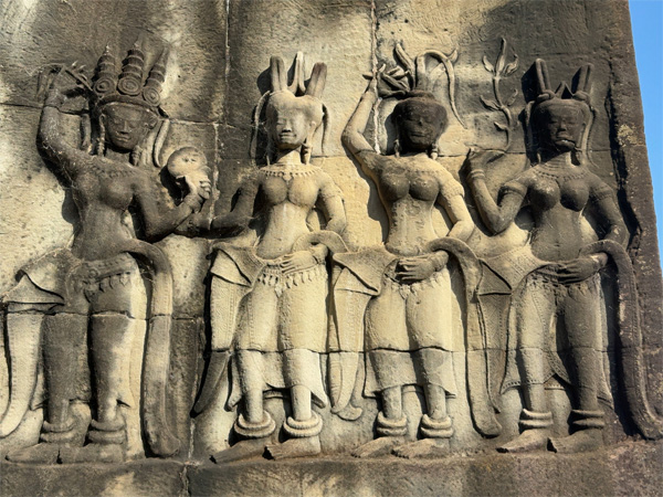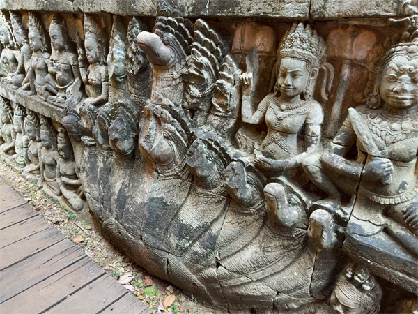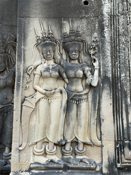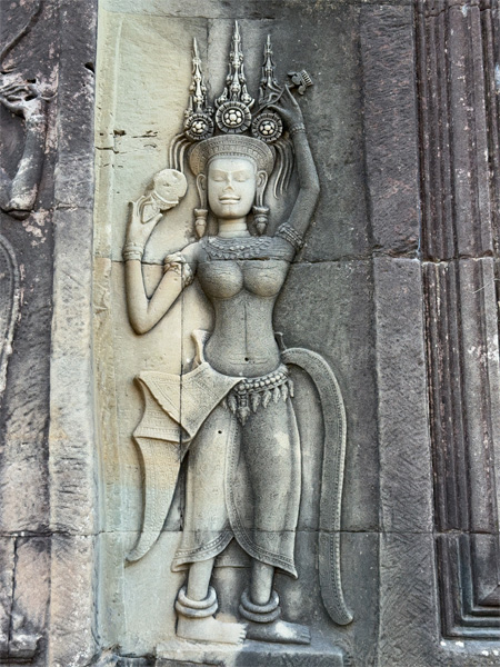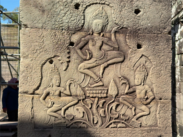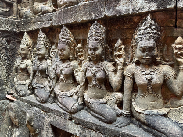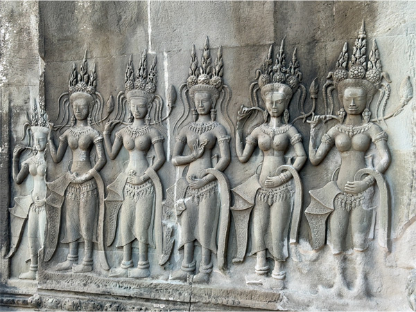 アンコール・ワットとその周辺の遺跡の見学では、彫刻の写真を、特に女神・デヴァターの像をたくさん撮りたいとガイドさんにお願いしたところ、撮影の時間をたっぷり取りながら案内してくださった。どの遺跡にも柱や壁に美しい彫刻が施されていて、まるで石彫の森を歩いているようだった。