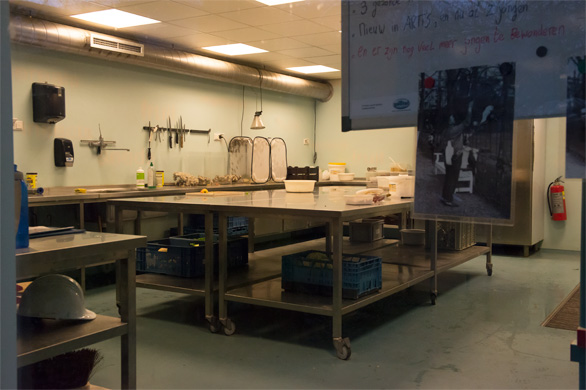 | ↑動物さんの食事の調理場なんて、めったに見られないもんね。係員さんの留守をいいことに、開け放たれた扉の間から激写。包丁だけで何種類もある。 |