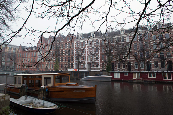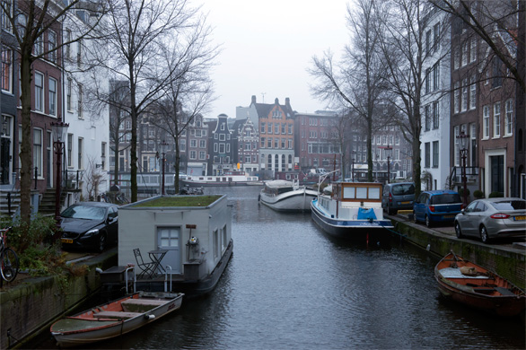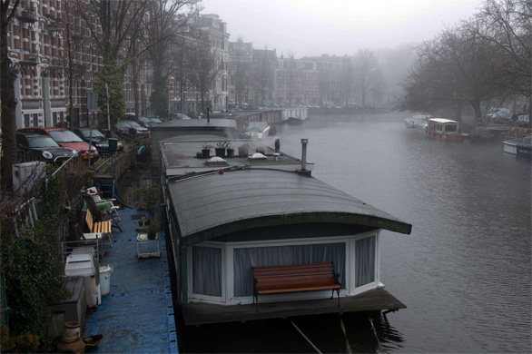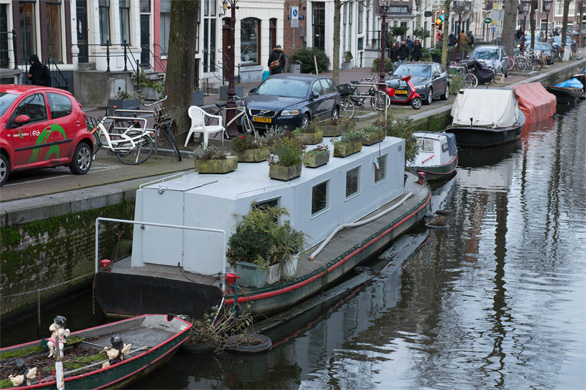 運河の岸に係留されている船の中には、まるで普通の家のようなものがある。窓も扉も船の造りとどこか違うし、ふりふりレースのカーテンが掛かっていたり、表札らしきものが張り付けてあったりする。屋根や甲板には植木鉢が並び、煙突から灰色の煙が立ち昇る。人が暮らしているのは明らかだ。こうした船はれっきとした住宅で、建築(?)許可の下りる件数が限られているため、資産価値が非常に高いらしい。船の形はしていても、エンジンは付いていないそうだ。