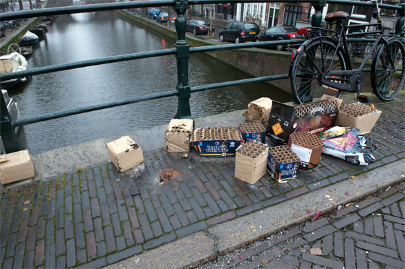 | ↑大晦日の夜はひと晩中花火が上がっていた。翌1日もあちこちからぽんぽん聞こえていた。写真は2日の朝に写したもので、地面に転がっているのは全部打ち上げ花火の空き箱だ。そうと決まっているのか、なんとなくなのか、この橋の上は花火の空き箱の集積場だった。写真を撮っている間もお兄さんがやってきて、ひと箱置いていった。 |