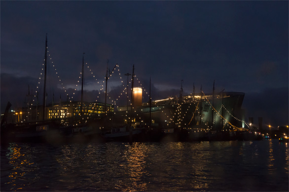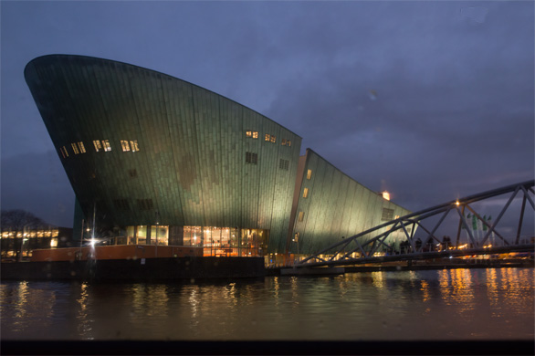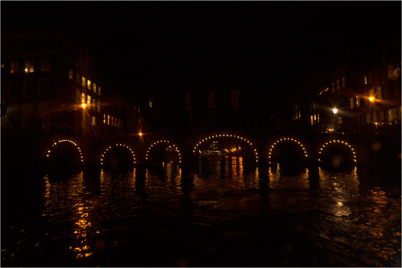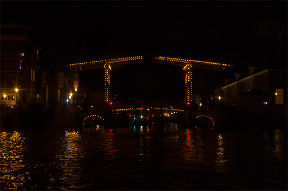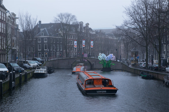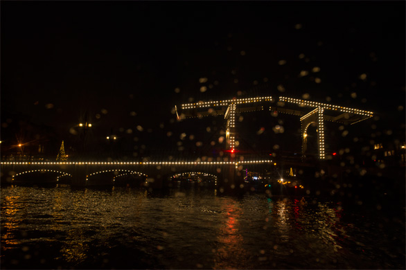 昨年12月から1月22日まで、電飾祭「アムステルダム・ライト・フェスティバル」が開催された。今シーズンで5回目を迎えるイベントで、アーティストによる20点の光のオブジェが夜の運河を彩るという。アムステルダムで観光船に乗るなら、夜もおもしろそうなので、カナル・カンパニー社(旅行当時。現在は「ストロンマ」に改称)のツアー、Water Colors Premiumを予約した。乗船券とガイドによる解説がセットになった一般的な夜景クルーズに、軽食が付いたツアーだ。