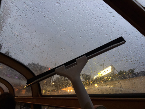 | ↑各座席のテーブルに、結露を落とすためのスクイジーが置いてある。なかなか気の効いたサービスだが、悲しいかな、外側の水滴には太刀打ちできないよう。 |