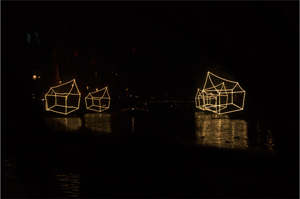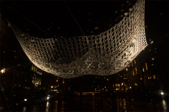 | ↑光のアート'The Lace'。運河の真ん中に吊るされた巨大なレース編み。 |