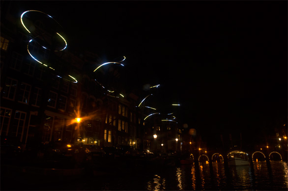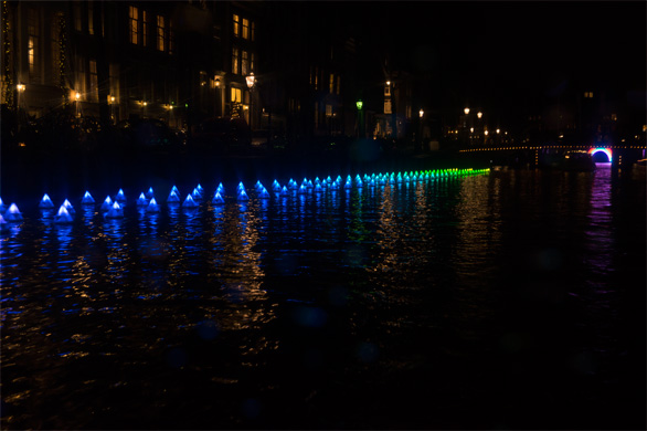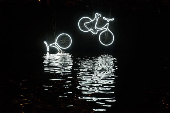 | ↑光のアート'15000 and more'。アムステルダムでは年間15,000台もの自転車が運河の底から引き上げられることから、このタイトルが付いたそうだ。 |