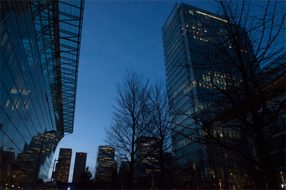 | ↑トラムを降りて広場を抜けると南駅がある(写真では奥の方向)。広場の両側には、ワールド・トレードセンター・アムステルダムの近代的なビルが立ち並ぶ。日の出の少し前、8時半ごろ撮影。 |