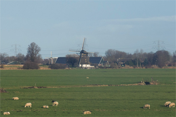 | ↑遠くに風車を見つけた。写真から風車を切り出したら、なんと、左奥にもう1基写っているじゃないの。今や、オランダ名物の風車は観光向けがほとんどで、実際に稼働しているのはごくわずからしい。用途は主に排水だそうだ。写真のこの2基は、周囲の様子から観光用ではなく、現役かもしれない。 |