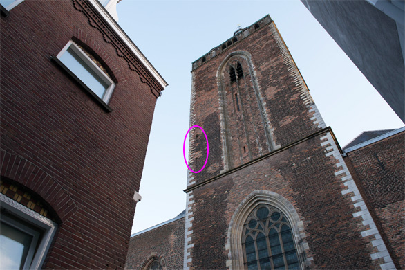 旅行前、インターネットでユトレヒトについて調べていたら、街の真ん中に珍しいものがありながら、あまり知られていないことがわかった。Google翻訳するなどして場所を突き止め、iPhoneの地図アプリにマークを入れた。ドムの塔のすぐ近くだった。ユトレヒト行きの楽しみの一つになったその「珍しいもの」とは、16世紀後半、一帯を支配していたスペイン軍が、郊外の砦から市街地を狙って撃った大砲の弾で、教会の壁にめり込んだものが2つ、今もそのまま残っているという。