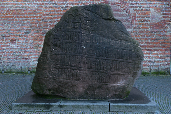 | ↑ユトレヒト大学の前に、北欧古代文字のルーン文字が刻まれた「ハーラルの石碑」がある。ただ、これはレプリカで、本物はデンマークのイェリング墳墓群にあるとのこと。 |