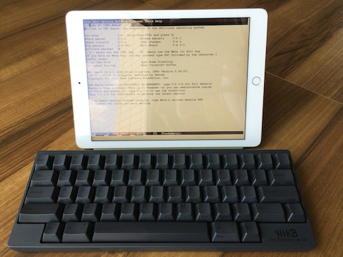」 私(青筋が数本増える)「今回、また1台増えて3台になった理由は?」 私「HHKBはどんな人向きだと?」 私「キーを入力する時の音が、私のキーボードよりカチャカチャいうみたいだけど。」 とかなんとか言いながら、ソノ時になったらメーカーの発売予告ページを食い入るように見つめるに決まっているのだ。 さて、家庭内インタビューはこれにて終了。おとうさんは仕事でiPadを連れ、あちこち移動することが多い。外出先でアプリを介してLinuxサーバーにリモートログインし、Emacsでメールを読んだり文書を書いたりするそうだ。近ごろ、iPad Proをゲットした。連休が明けたらHHKBもいっしょに連れて行くのだろう。ケーブルのなくなったHHKBなら、Linuxでの作業も快適に違いない。