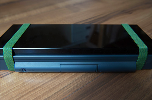 HHKBの最新機種は背面に電池ボックスがぽこんと出ている。ルーフをかぶせ、この電池ボックスの両脇にゴムバンドをかけたら、袋へ。モバイルHHKBの完成なのだ。おとうさんと一緒に行ってらっしゃ〜い。