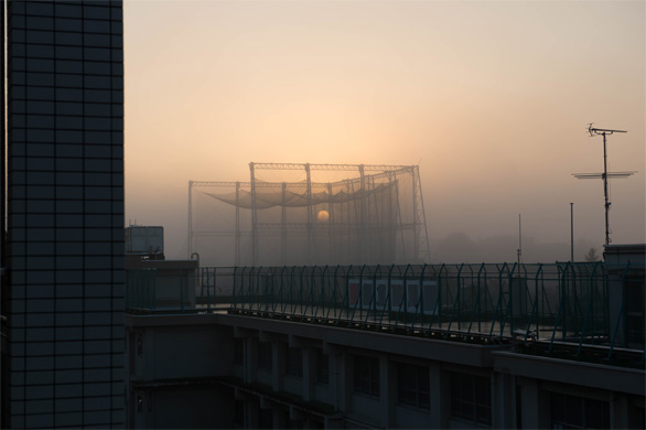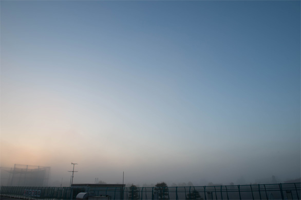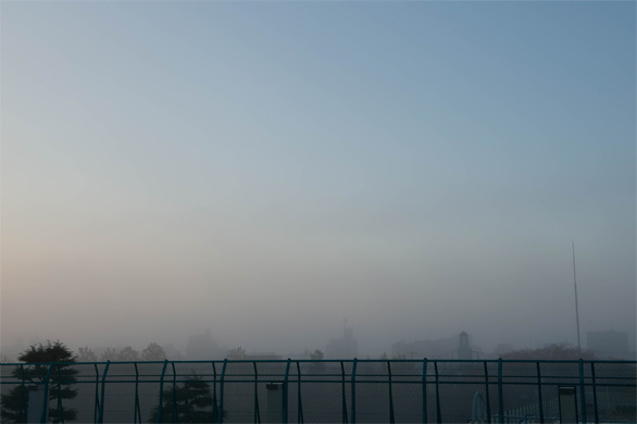 ↑フェンスはお向かいの学校で、校庭の端のサクラがきれいに紅葉しているが、霧で色の区別がつかない。