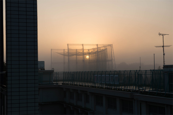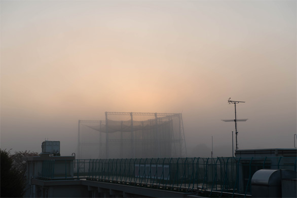 6時30分、暖かい霧の朝。東京都区部の自宅ベランダにて。