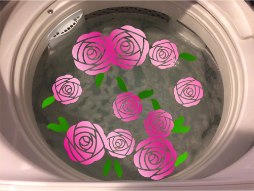 1) 洗濯機の電源を入れたら、標準コースの「洗い」だけ残して、つまり、「すすぎ」と「脱水」はナシにして「スタート」ボタンを押す。衣類の入っていない洗濯機は漂白剤を溶かしながら、8分の間、ごろごろと回っていた。 「洗い」が終わったので、洗濯槽の水がどんなふうになったのか、怖いモノ見たさでフタを開けた。チョットだけヨ・・・げげげ。毎年見ているけれど、やっぱりばっちいぞう。次の写真はその衝撃の瞬間で、お見苦しいのでばっちい部分を花の絵でごまかしてある。