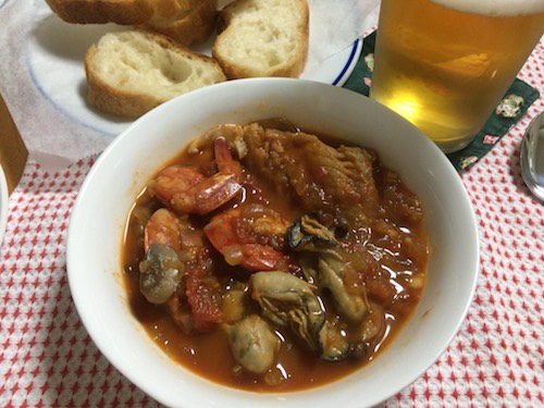 2) 味見しながらスープに少しずつ塩を追え、好みの塩加減にする。酸味が気になるなら、トマトケチャップを大さじ半分ほど加えるとマイルドになる。 3) トマトスープに魚介類をすべて入れて再び火にかける。表面がぐつぐつしてきたら弱火にし、アクをすくいながら20分間煮る。今回は使わなかったが、ムール貝など貝殻付きの貝は10分ほどで殻が開き、火が通る。 冒頭の写真のブイヤベースのできあがり。すぐに食べられるけれど、ひと晩寝かすと旨みがしみて、もっとおいしくなるヨ。 ![]() |