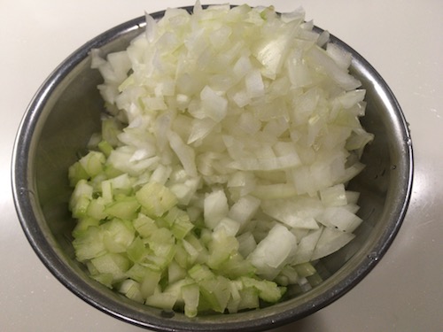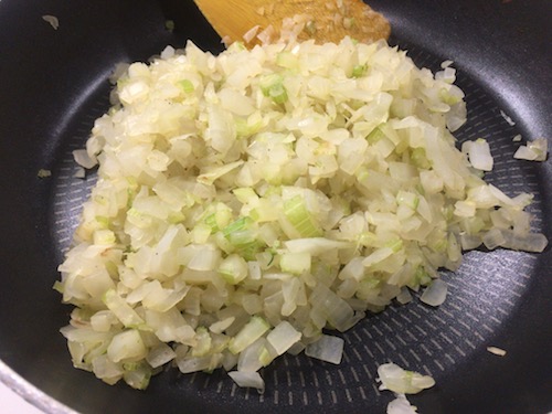 1) フライパンにサラダ油を引き、玉ねぎとセロリの粗みじん切りを炒める。こしょうとごく少量の塩も加える。この塩は味付けではなく、野菜の旨みを引き出すため。
