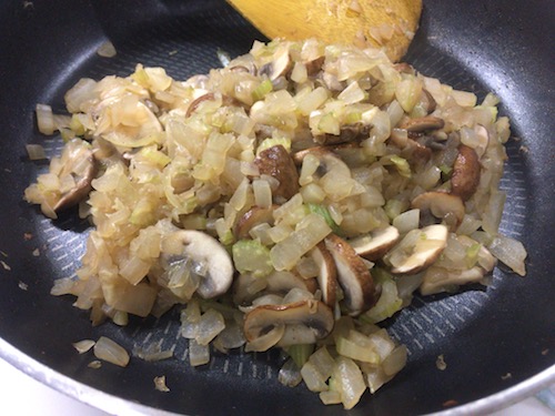 2) 野菜から青臭さが消えて香りが立ち、全体が透き通ったら、マッシュルームを加えてさらに炒める。