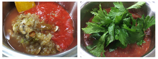3) マッシュルームにしっかり火が通ったら、フライパンの中身を鍋に移す。トマト、水300ccを加えて(次の写真・左)全体を混ぜ合わせ、火にかける。沸騰したら弱火にし、コンソメスープの素を加えてよく混ぜる。香り付けにセロリの葉を入れたら(同・右)、アクをていねいにすくいながら煮込む。
