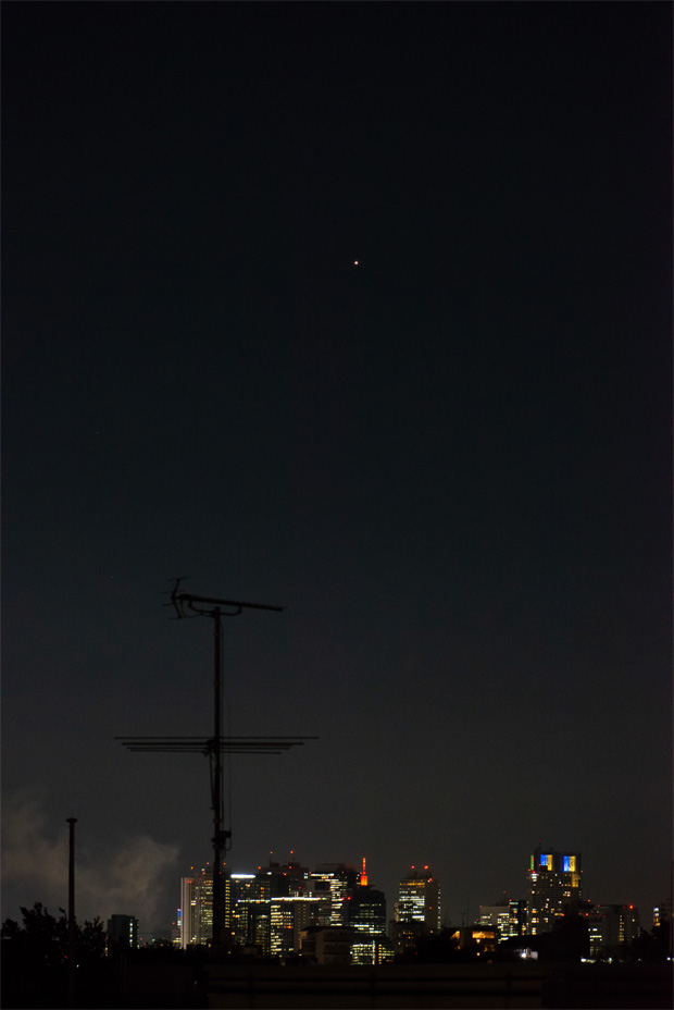 火星が15年ぶりに地球に大接近しているそうだ。南東の方角にある新宿の高層ビルを眺めたら、真上に赤い明るい星が見えた。どの星よりもずっと明るい。話題の火星に違いない。おとうさんの望遠レンズとテレコンバーターを借り、網戸を開けて手早く写した。蚊が入ってくると困るからね。