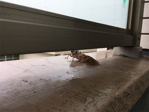 台風13号が迫る朝、我が家のベランダで雨宿りしているアブラゼミを発見。ニンゲンにとって雨粒は何でもないけれど、ほとんどの虫にとってはベトベトとまとわりつく、まことに始末の悪いモノだと聞いたことがある。