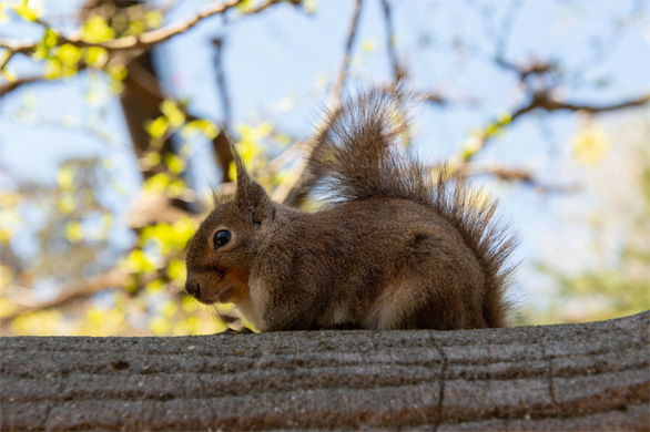 | ↑丸太に伸び上がり、木の皮を懸命に剥ぐリス。今、巣作りの真っ最中で、剥ぎ取った木の皮を口一杯くわえ、天井近くの巣箱に運び入れていた。丸太の皮を剥ぐ動作は珍しいそうで、たまたまその場に居合わせた私たちはラッキーだった。 |