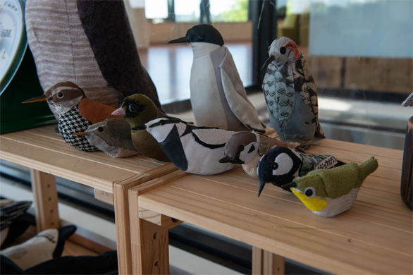 | ↑野鳥公園で見られる鳥のぬいぐるみが展示されている(次の写真も)。大きさも重さも本物と同じになるように作られているそうだ。表情や姿勢からも鳥の特徴がよくわかる。スタッフの方の手作りだろうか。柄物の布をまとったコもいて、かわいい。実際に手にとってみると、カラスがかなり重くて意外だった。 |
