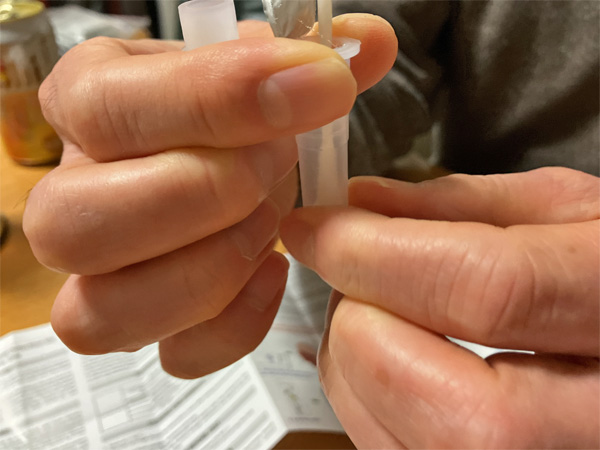 2. 袋から綿棒を取り出す。そ〜っと鼻の穴に入れたら、回転させながら粘膜をこちょこちょこする。片方ではなく、左右両方の鼻の穴をこちょこちょする。綿棒のヘッドは柔らかく、スポンジに近い感触だった。 3. 鼻の粘膜(検体)をくっつけた綿棒をチューブの薬液に浸す。チューブの先端を軽く押さえながら綿棒を5回、くりくりと回転させて検体を薬液に移したら(次の写真)、綿棒を取り出してチューブのフタ(てっぺんが注ぎ口になっている)をしっかり閉める。綿棒の役目はこれでおしまい。廃棄用ポリ袋に入れる。