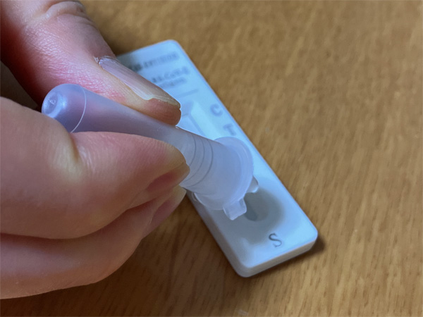 4. 'S'とか'C'とか書いてある面に触れないように注意しながら、検査プレートを袋から取り出す。チューブを逆さにして押さえ、'S'の表示のあるくぼみに4滴落とす(次の写真)。