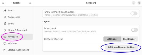 2. Tweaksで設定する Tweaksを起動し、次のようにして設定した。 左端のメニューから[Keyboard]を選ぶ(次の画像・ピンクの円)。