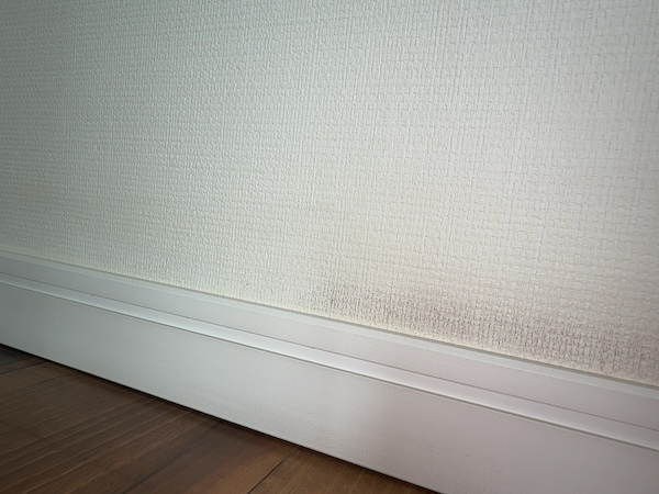 次の写真は巾木の上を掃除した様子。左半分、黒ずみが落ちてきれいになったでしょ。右半分はこれから。