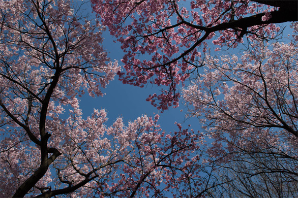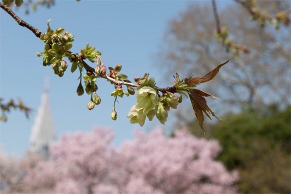 4月12日 カンザン(中央)とヤエベニシダレ/p>