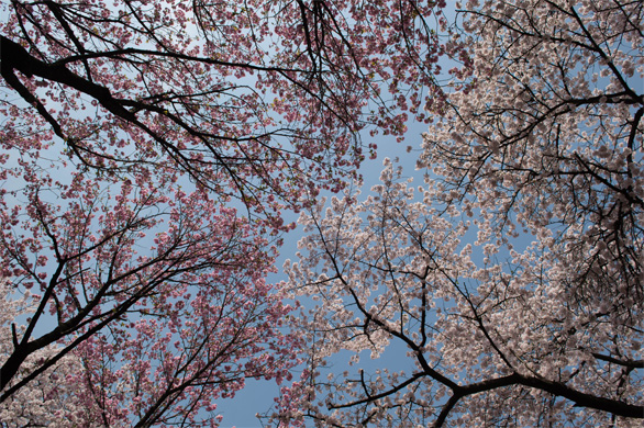 4月6日 タイハク(白)、ヤエベニシダレ(濃いピンク)、ソメイヨシノ