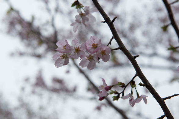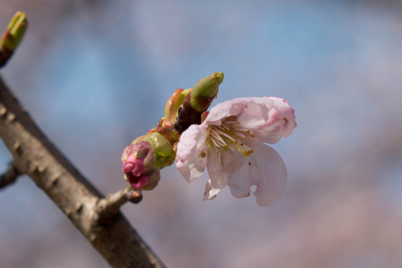 3月31日、今年の花を初めて見た。この木の1輪目なのに、もう花びらに穴が開いている。つぼみの間に虫にかじられたのかな。