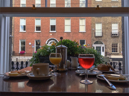 ダブリン旧市街の南部にあるホテル、「アルバニー・ハウス」に2泊した。ダブリン城や有名な教会まで歩いて10分程度の距離で、すぐそばには緑いっぱいの大きな公園が2つもある。おとうさんも私も時差ぼけであまり食が進まず、残念ながら足が向かなかったが、1本向こうの通りにはレストランやバーが軒を連ねている。トラムが通い、人通りも絶えない大きめの道に面しているが、奥まった部屋のおかげで夜はとても静かだった。 備品がもう少し充実していてもいい気はするが、ホテルの格に恥じず、家具や内装は上質だった。フロントデスクやダイニングなどスタッフの皆さんは、評判通りのほがらかなアイルランドの人そのものだった。 以下の写真は朝食ダイニングで、くだものとチーズとパンが中心の、おいしくてヘルシーな朝ご飯だった。コーヒーはいかが、トーストはいかがと、にこやかにテーブルを巡るヒゲの熟年係員さんのおかげで、ダブリンの明るい朝がますます明るくなった。