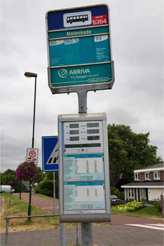 交通機関の乗り換えがうまくいったため、乗車予定のバスの発車時刻よりかなり前にCのりばに到着したら、ちょうど1本前の90番バスが出発するところだった。予定していた便に乗ればいいことなので、急いだりしなかったのだが、いかにも観光客らしい私たちに運転手さんが気づいたようで、ありがたいことにバスを止めて待っていてくれた。乗車の際、運転手さんにキンデルダイクの停留所「モレンカデ」に止まることを確認したのだが、キンデルダイクの近くまで来たら、「左手に風車が見えるよ!」と教えてくれた。行く手の遠くに、楽しみにしていたオランダの風車が並んでいた。旅行前はキンデルダイクに行き着く自信がなく、やめておこうかとも思ったが、アリーヴァの運転手さんのおかげで、「やっぱり来てよかったなぁ」と感じた。