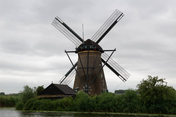 オランダの風物詩といえば、チューリップと風車がいちばん有名だろう。その風車を眺めに、アムステルダムから列車と路線バスを乗り継いで、キンデルダイクへ行った。キンデルダイクにはオランダ最大の風車群があり、「キンデルダイク=エルスハウトの風車網」という名前でユネスコ世界遺産に登録されている。 キンデルダイクでは1740年ごろ、干拓地の排水のため19基の風車が建設されたそうで、今も運河に沿って同数の風車が立ち並んでいる。風車はどれもとても大きい。建物も高ければ羽根も長くて驚いた。以前、ベルギーのブルージュで見た風車は小麦の製粉用だそうで、ずっと小型だった。土地の排水が目的ともなれば、建物も仕掛けも大掛かりになるのだろう。