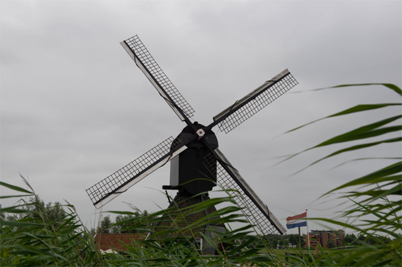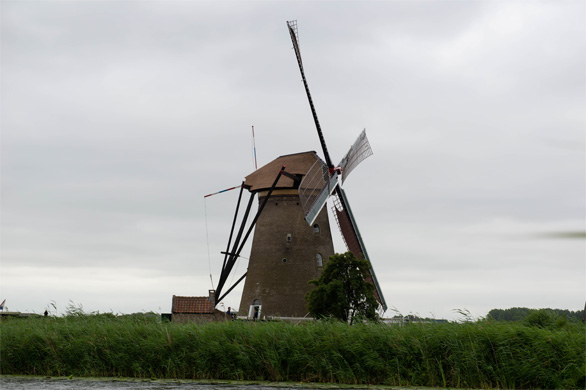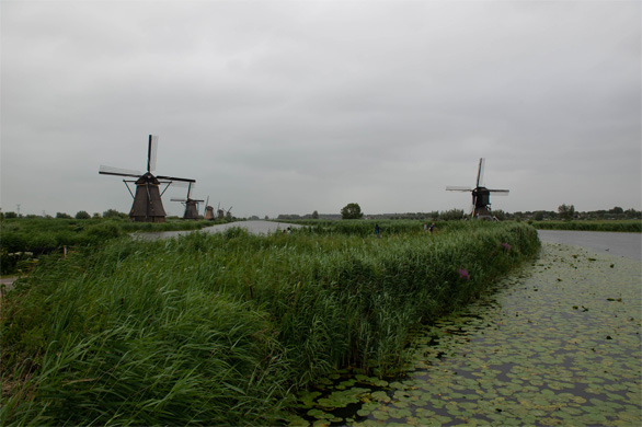 チケット売り場から南端の風車まで、片道約2.2km。相変わらずののんびり歩きなので、往復するのに1時間40分もかかった。ときおり霧雨が舞い、東京の11月上旬ごろの肌寒さだった。背の高いアシがさらさらと風に揺れ、水面にはスイレンが開くオランダの初夏。晴れていれば風車ももっときれいだっただろう。