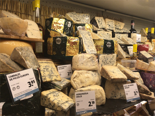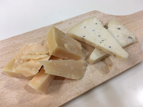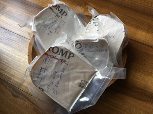 | ↑フンパツして4種類のチーズを購入。このうち、熟成ヤギ乳ゴーダ(左)とオランダ産のブルーチーズを切り分けた。どちらもコクが深くておいしい。ブルーチーズはマイルドで食べやすい。小分けしたチーズはラップでしっかりくるみ、保存用ポリ袋に密封して冷凍すれば、1と月前後は自然解凍でおいしく食べられる。解凍後はすぐに風味が劣化するので、早目に食べ切るべーし。 |